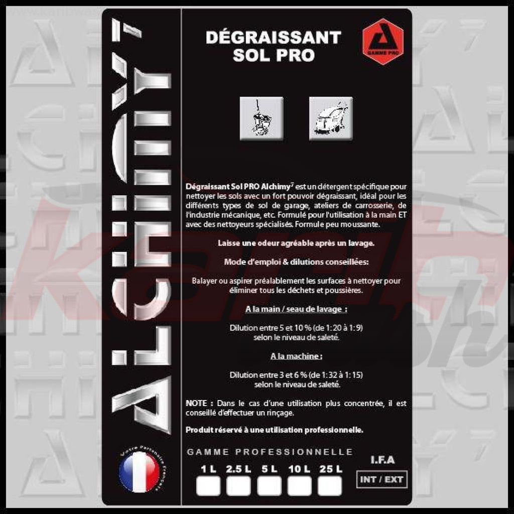 Dégraissant Sol PRO Alchimy est un détergent spécifique pour nettoyer les sols avec un fort pouvoir dégraissant, idéal pour les sols de garages, ateliers de carrosserie, de l'industrie mécanique, etc. Formulé pour l'utilisation à la main et avec des nettoyeurs spécialisés. Formule peu moussante.