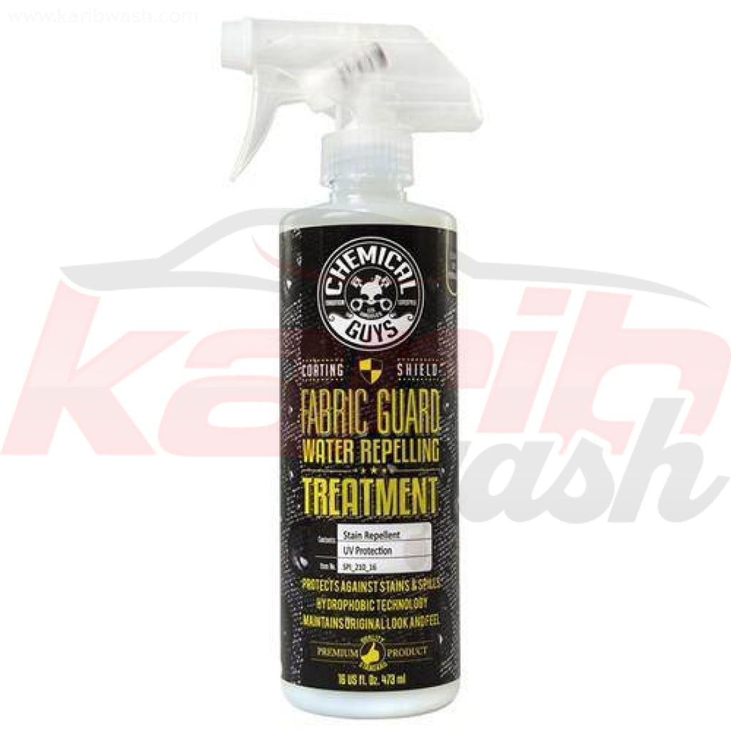 Chemical Guys Fabric Guard est une protection qui évite les tâches grasses et repousse l'eau sur les tissus. Ce produit permet également une protection contre les UV et il est utilisable sur les tissus intérieurs ou sur les capotes de votre véhicule. L'effet persiste jusqu'à 8 mois.