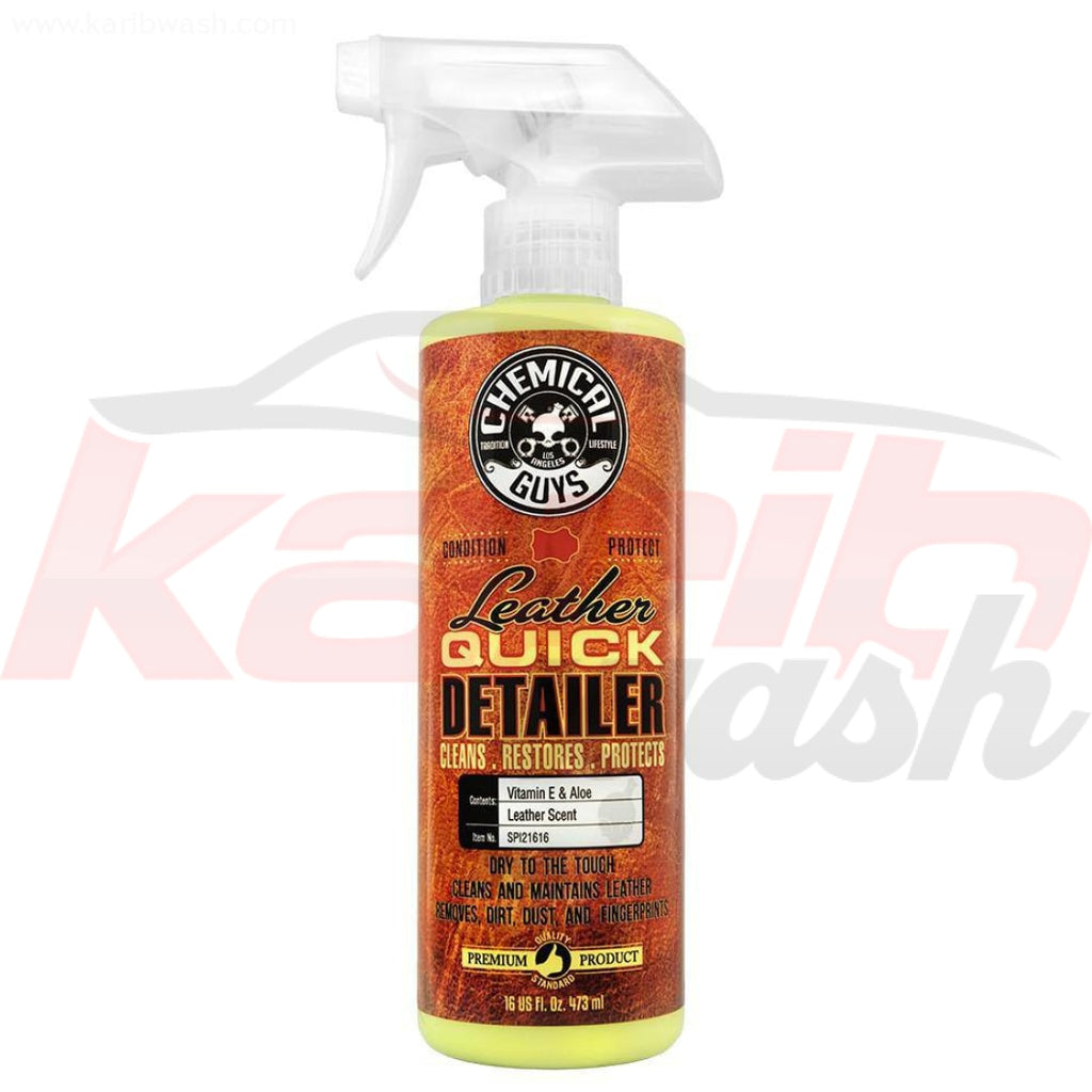 Chemical Guys Leather Quick Detailer nettoie, nourrit et protège les surfaces en cuir en une seule étape. Ce nouveau produit Chemical Guys élimine facilement la saleté légère, la poussière, les empreintes digitales et autres traces de nourriture.